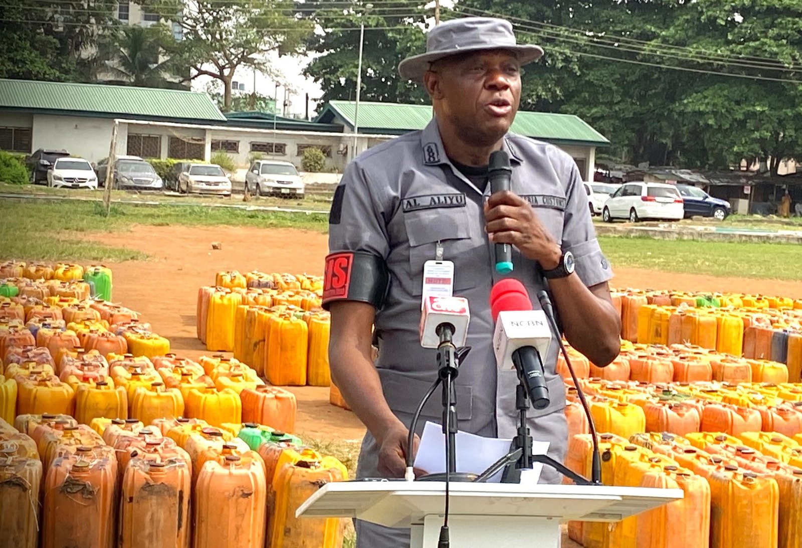 National Co-ordinator, Nigeria Customs Service (NCS), Operation Whirlwind (OW), the specialized enforcement unit of NCS, Deputy Comptroller General (DCG) Lucky Aliyu speaking on behalf of the Comptroller General of Customs (CGC), Dr. Bashir Adewale Adeniyi at the formal display of three trucks laden with diverted petroleum products intercepted by officers and men of OW at Customs Training College, Ikeja, Lagos…recently.