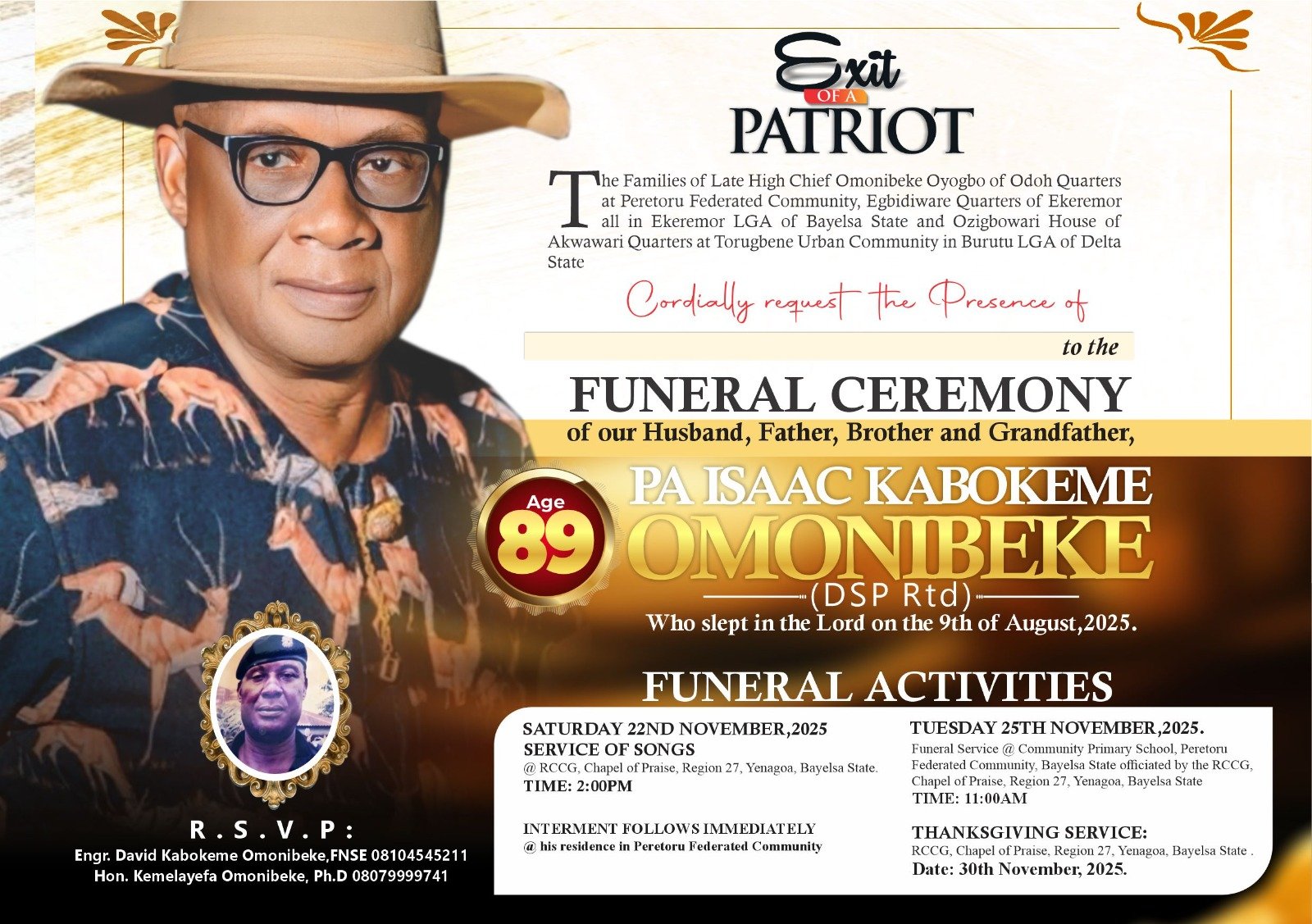 The remains of Pa Isaac Kabokeme Omonibeke, the father of the erstwhile Executive Director, Marine and Operations, Nigerian Ports Authority (NPA), Engr. David Omonbeke will be laid to rest on Tuesday November 25, 2025 at his hometown, Peretoru Federated Community, Ekeremor Local Government Area, Bayelsa State,